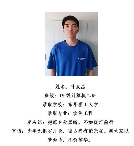 先进典型 优秀毕业生 优秀学生风采 优秀教职工 您现在的位置是:首页 > 先进典型 > 优秀毕业生 叶泉昌 管理员2023-09-011898 上一篇 王涛 下一篇 青春榜样力量||优秀毕业生——华文新