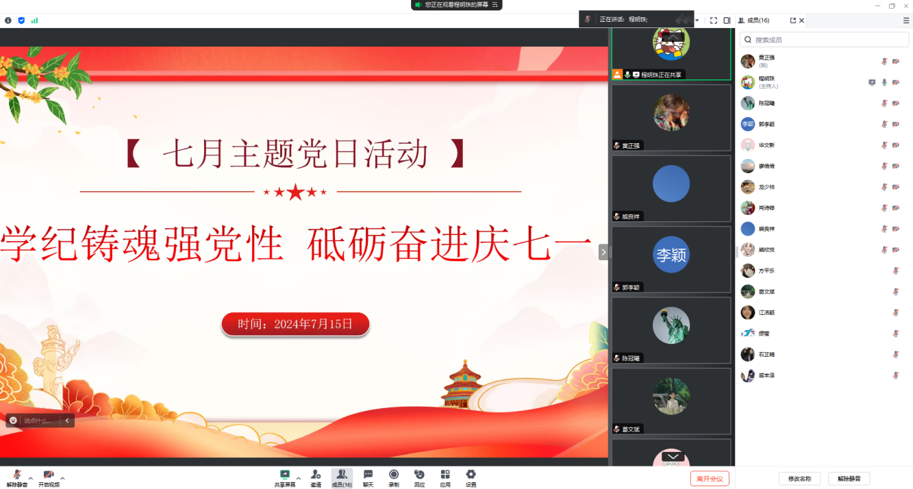 为庆祝中国共产党成立103周年,弘扬伟大建党精神,贯彻落实新时代党的建设总要求,进一步健全全面从严治党体系推动党纪学习教育走深走实,williamhill威廉希尔中文网站第二党支部于7月15日召开线上会议,开展了“学纪铸魂强党性 砥砺奋进庆七一”主题党日活动。