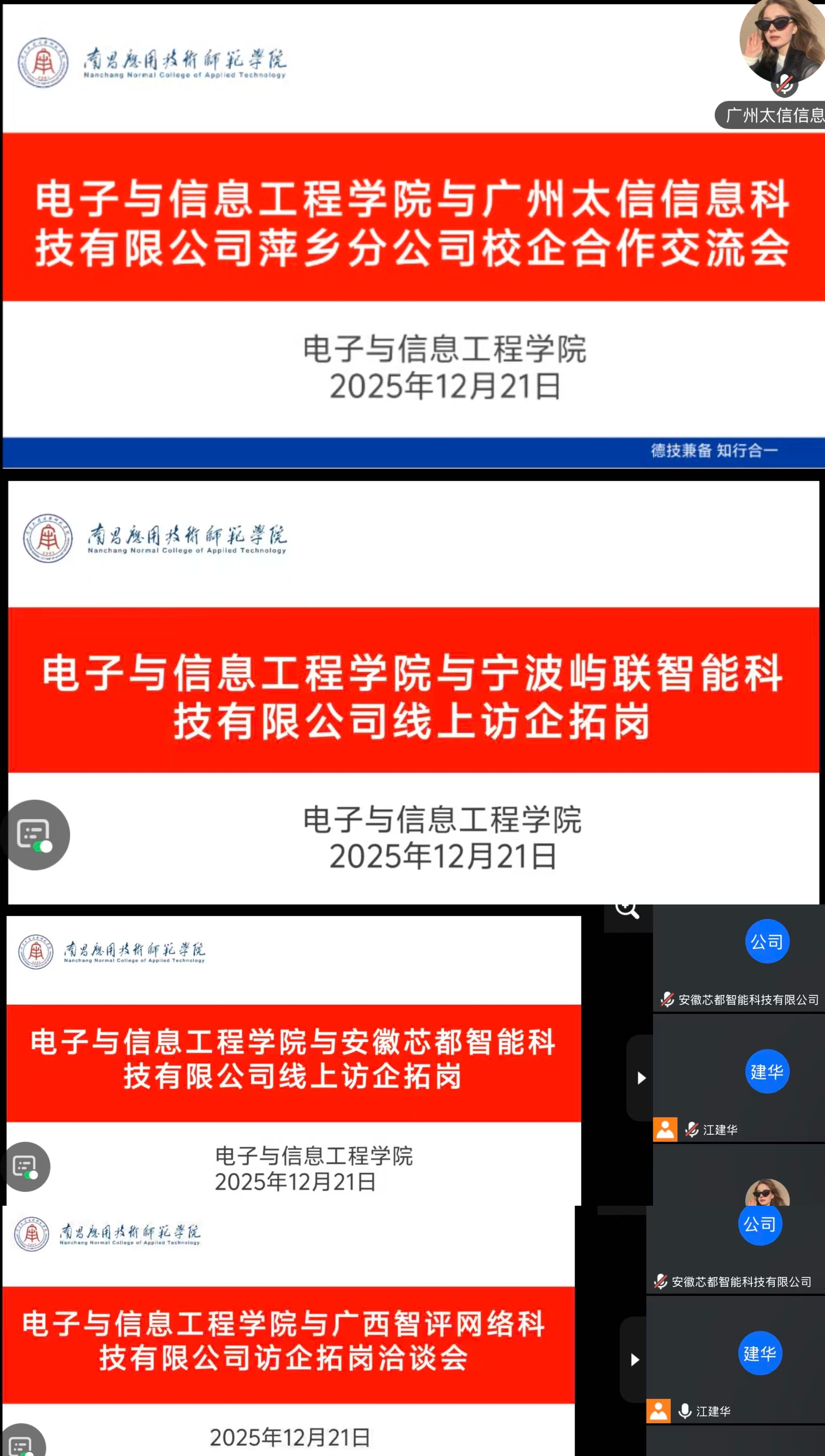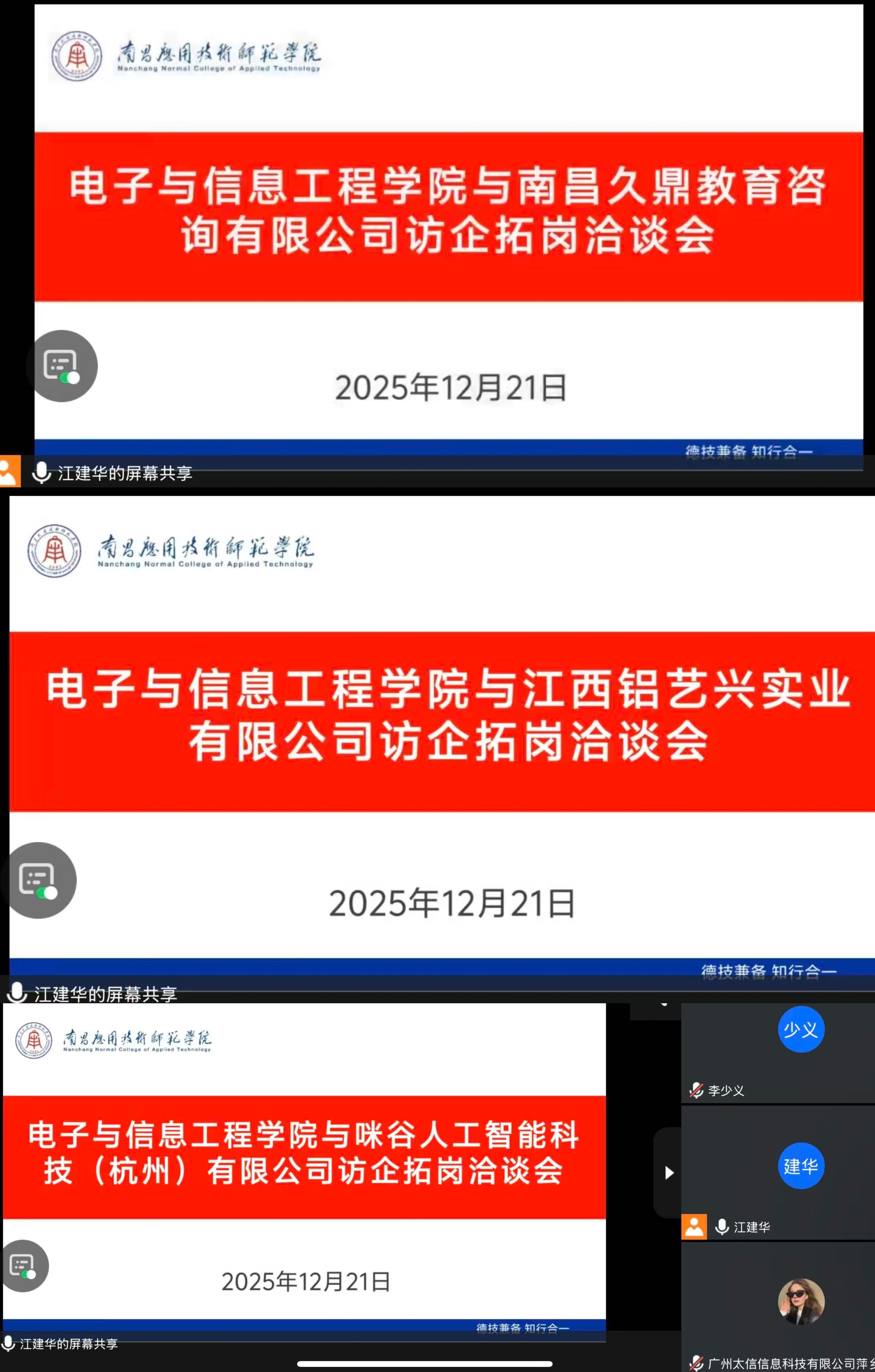 为深入贯彻落实党中央、国务院关于高校毕业生就业工作的决策部署,精准对接行业需求,拓宽毕业生就业渠道,12月21日,williamhill威廉希尔中文网站组织开展线上访企拓岗专项行动。校长助理李少义、学院党总支书记江建华先后与广州太信信息科技有限公司萍乡分公司、宁波屿联智能科技有限公司、安徽芯都智能科技有限公司、广西智评网络科技有限公司、南昌久鼎教育咨询有限公司、江西铝艺兴实业有限公司、咪谷人工智能科技(杭州)有限公司等7家行业头部企业、重点用人单位进行线上座谈交流,深化产教融合、校企合作,为毕业生高质量就业注入强劲动力。