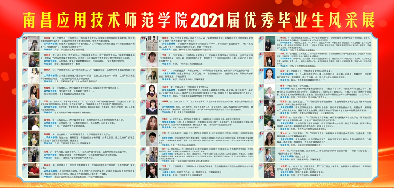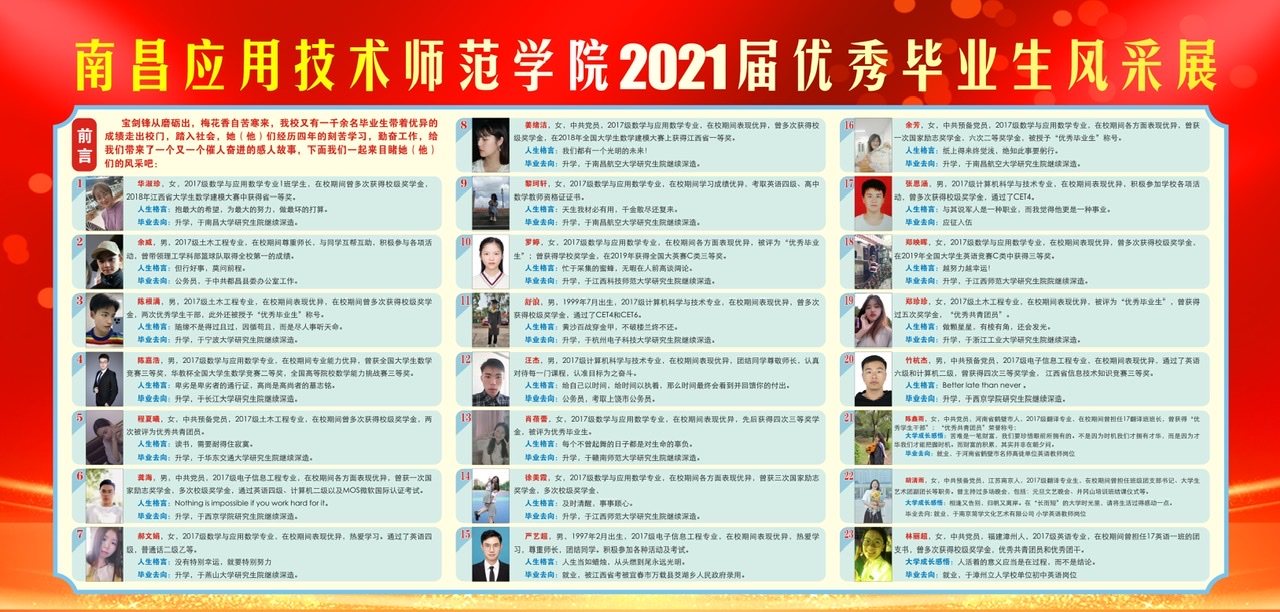 先进典型 优秀毕业生 优秀学生风采 优秀教职工 您现在的位置是:首页 > 先进典型 > 优秀毕业生 学校2021届优秀毕业生 管理员2021-07-212914 下一篇 青春榜样力量||优秀毕业生——华文新