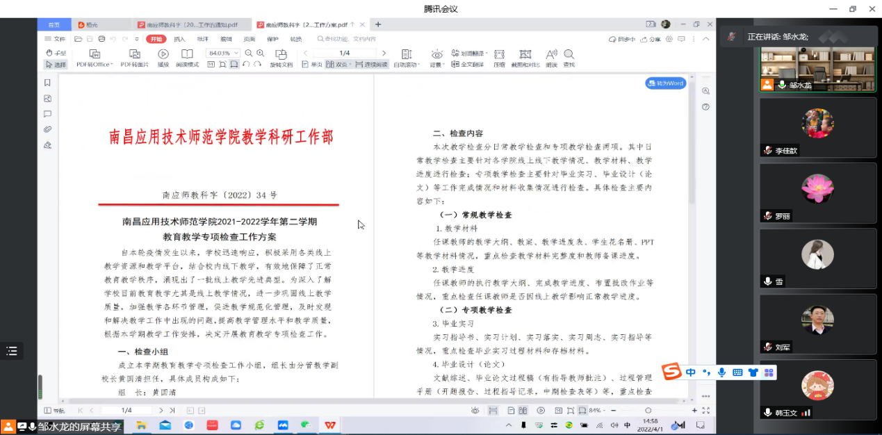 4月1日,williamhill威廉希尔中文网站利用腾讯会议,线上召开教研室工作会,教务管理人员、教研室主任参加了此次会议,会议由院长邹水龙主持。