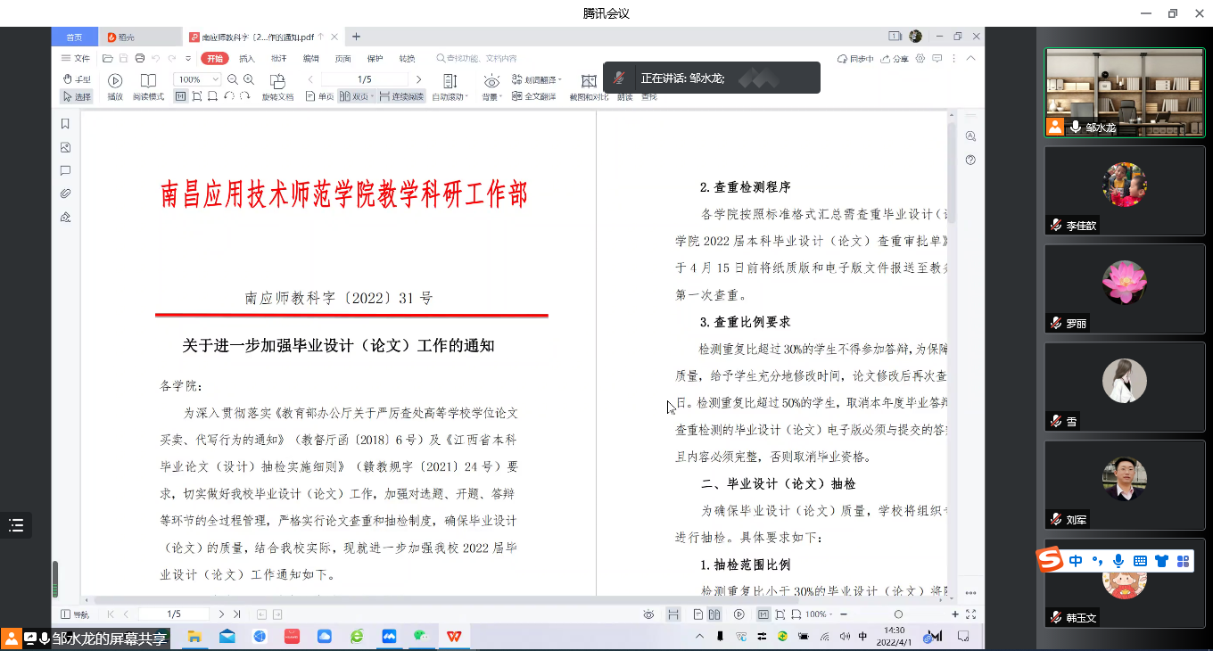 会上,邹水龙全文宣读了“关于进一步加强毕业设计(论文)工作的通知”(南应师教科字[2021]31号)、“williamhill威廉希尔中文网站2021-2022学年第二学期教育教学专项检查工作方案”(南应师教科字〔2022〕34 号)等文件,对毕业设计(论文)各个环节的工作进行了重点解读,邹水龙强调,毕业设计(论文)是人才培养重要环节,各教研室主任要提高认识,严格按照教育部、教育厅和学校相关文件要求,加强过程管理,加强督促,确保毕业生毕业设计(论文)质量。随后,与会老师围绕毕业设计(论文)指导、查重、答辩以及教育教学检查等方面工作进行了详细讨论。