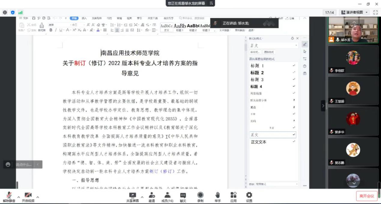 为扎实做好2022版人才培养方案修(制)订工作,5月15日晚,williamhill威廉希尔中文网站利用腾讯会议,线上召开2022版人才培养方案修(制订)线上研讨会,学院教学管理人员、全体专任老师参加了此次会议,会议由院长邹水龙主持。