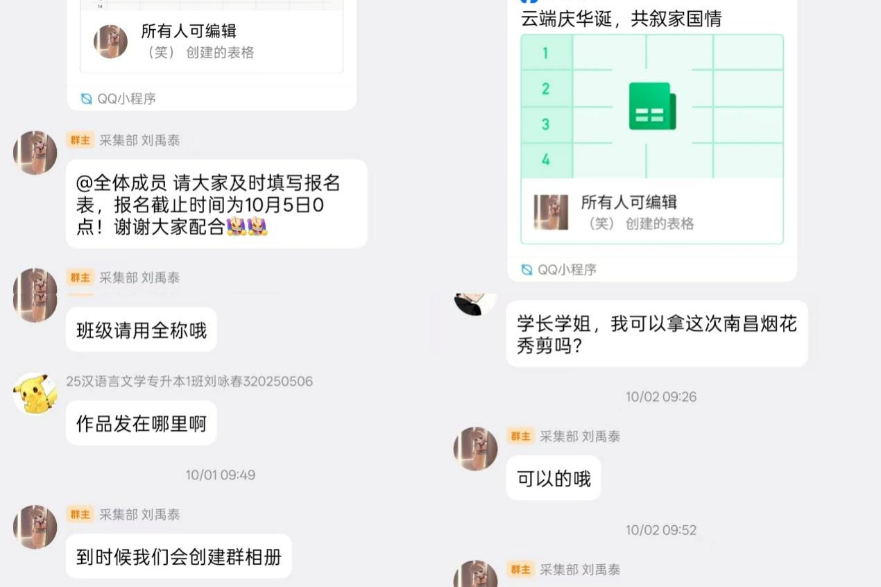活动伊始,为保障“云端庆华诞,共叙家国情”活动的顺利开展,准备工作从QQ建群、名单统计、技术保障、作品收集等多方面精心规划。在工作人员的引导下,参与活动的同学们踊跃分享个人作品,积极讨论活动内容,同时在活动持续期间内工作人员及时地为各位同学解答相关疑惑。