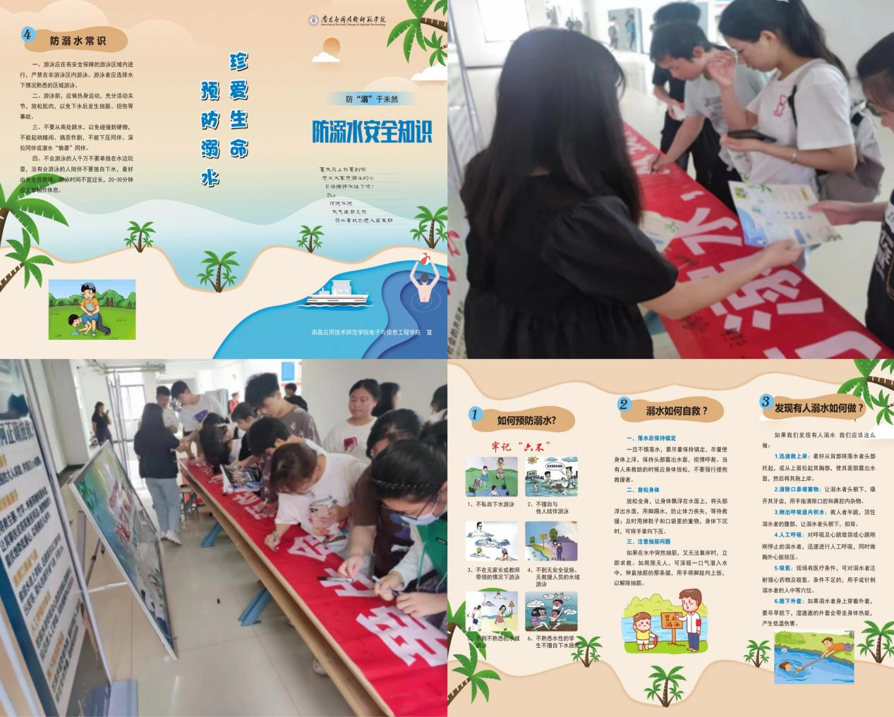 本次活动采取横幅、宣传海报、工作人员发放防溺水安全知识手册等多种形式展开,引导学生更加深入的了解防溺水相关知识,加强学生对防溺水知识的认知程度。活动期间,同学们纷纷在“安全第一,珍爱生命,预防溺水,从我做起”条幅上郑重签名,为确保自己远离溺亡危险作出承诺。