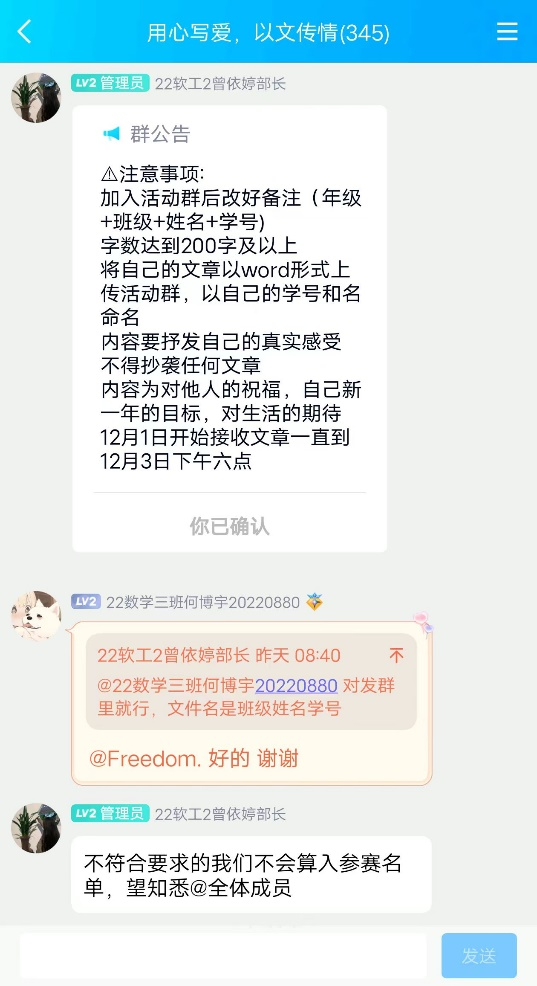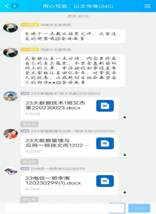 2023年12月1日早上9时,williamhill威廉希尔中文网站学生会在线上开展了“用心写爱,以文传情”活动。活动开展后,同学们都以饱满的热情投入到写作当中,工作人员在群里通知活动信息,收集学生提交的文档进行统计,审核每个人的文章是否符合活动要求,严格检查是否有抄袭现象。