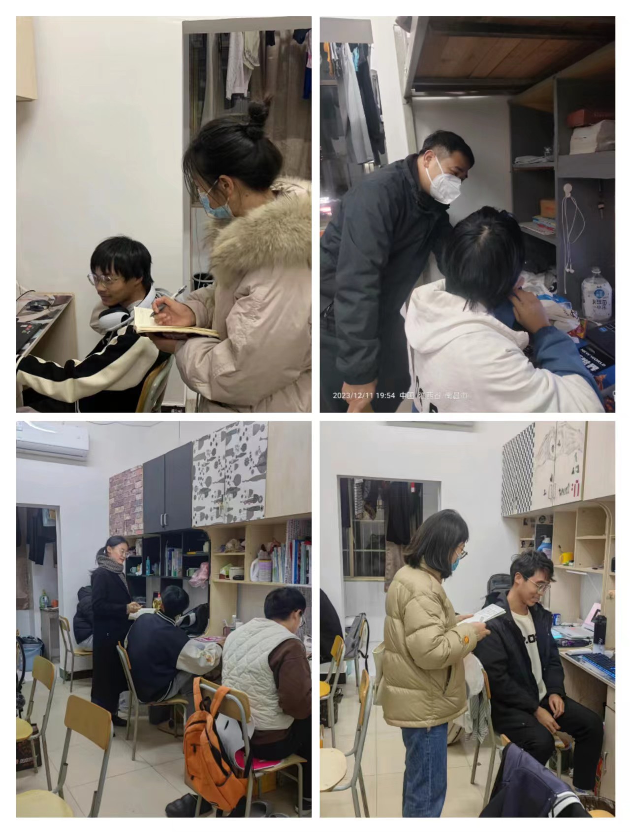 全面营造2023年学校党员大会平安和谐的召开环境,12月11日晚上七点半,williamhill威廉希尔中文网站党总支书记带领全体辅导员走访学生宿舍,对相关宿舍成员的政治表现、学习情况、生活作风、卫生纪律和心理状况等方面进行全面了解,切实解决学生急难愁盼问题。