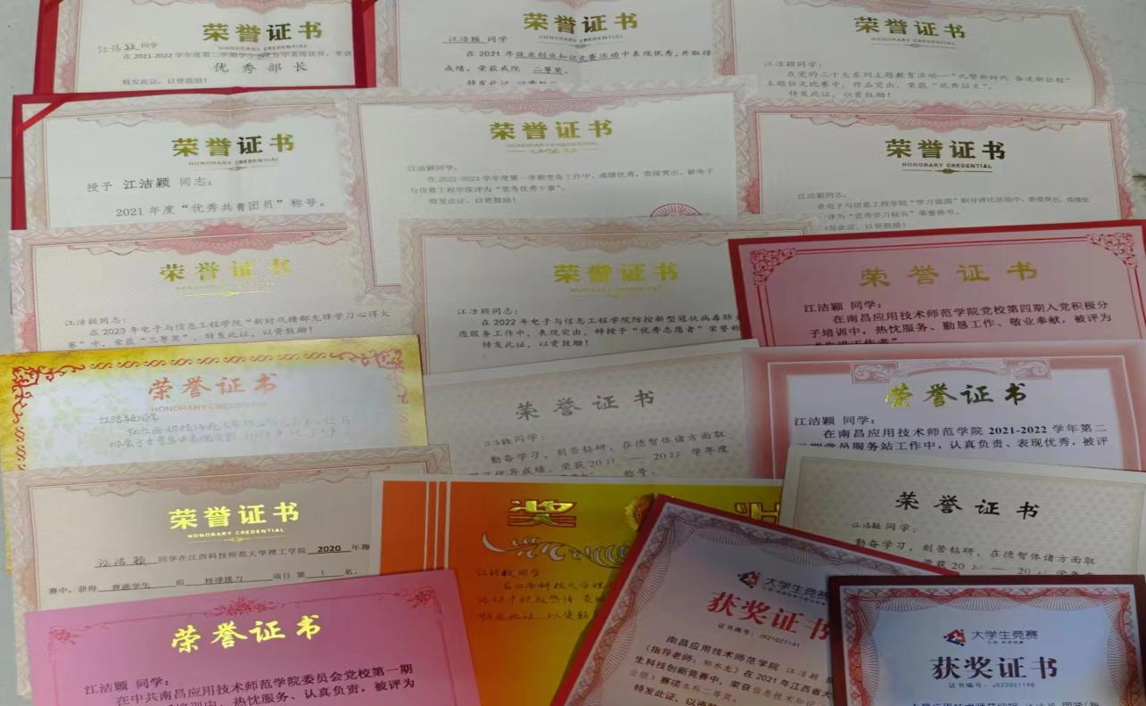 “持之以恒才能成就精彩的人生,坚持不懈才能铸就更大的辉煌。” 对于江洁颖来说,最快的脚步不是冲刺,而是坚持。她从大一刚入校时就认真钻研专业知识,刻苦学习,并且有意识培养自己的专业学习思维,深知作为学生要以学习为本,无论是想实现自身的价值,还是想在社会中能够具有竞争力,都必须要有良好的专业知识作为基础,因此始终把学习放在首位,有着明确的学习目标以及学习方法,通过努力,曾多次获得校奖学金,“优秀共青团员”荣誉称号、党校“优秀工作者”和“先进工作者”、“优秀志愿者”、就业创业知识竞赛“二等奖”、江西省大学生科技创新竞赛多次获得信息技术知识(专业类)赛项本科组二等奖。