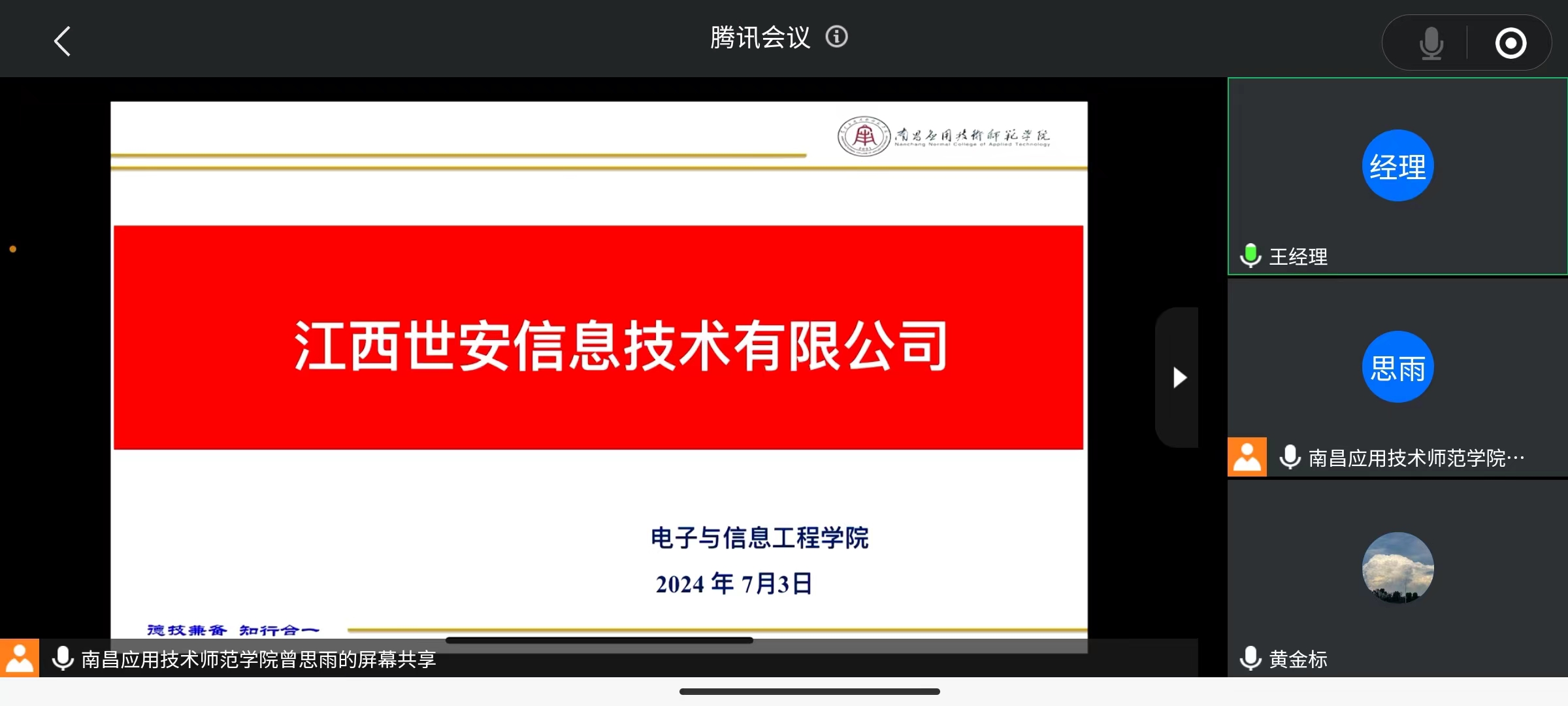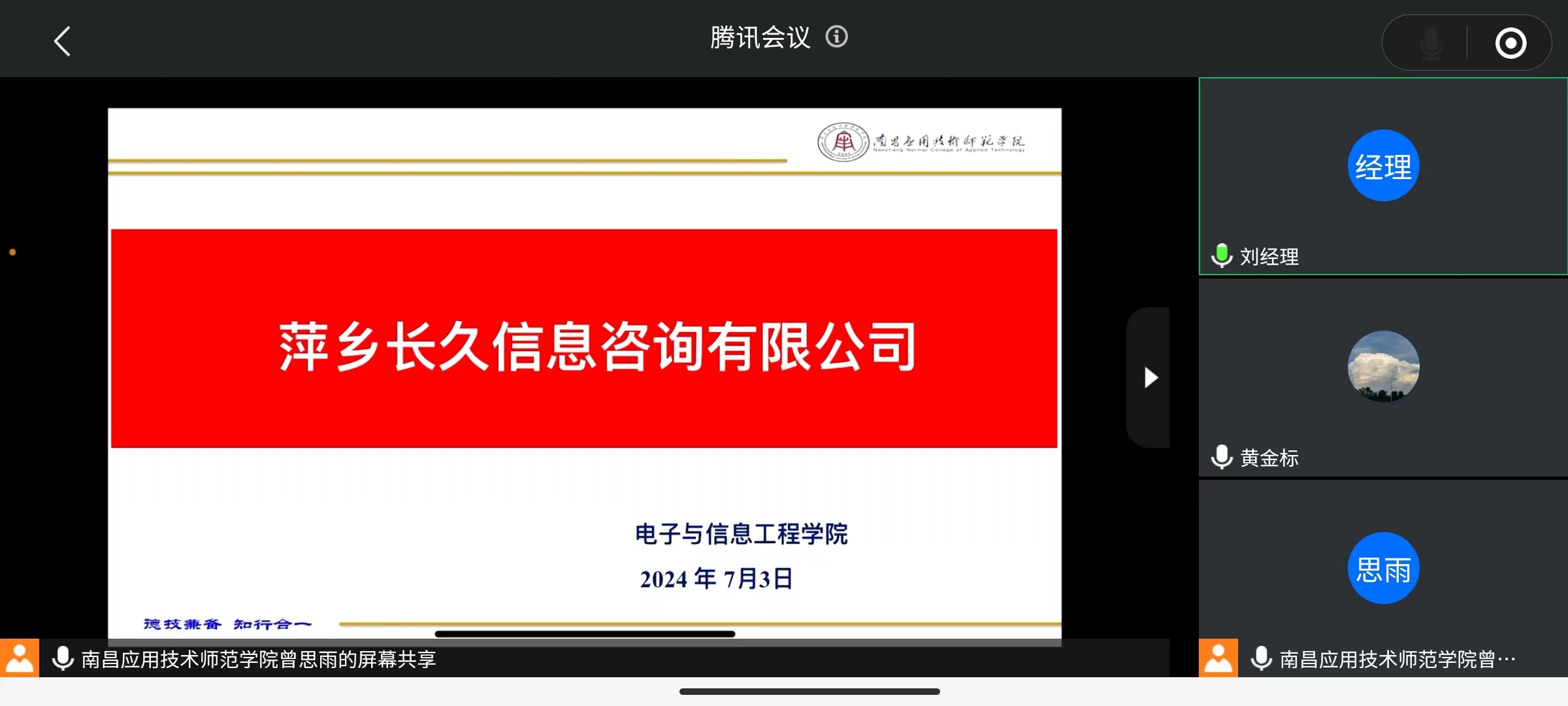 为开拓更多的就业岗位和机会,推动毕业生高质量充分就业。7月3日,威廉希尔官网与萍乡长久信息咨询有限公司和江西世安信息技术有限公司开展线上访企拓岗校企合作交流会。电子与信息工程学院党总支副书记黄金标与就业专员曾思雨参加本次会议交流会。