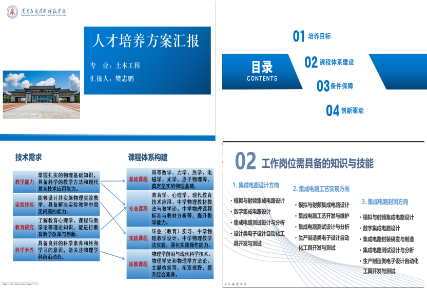 随后,各专业负责人围绕着人才培养目标、面向领域、对接岗位、技术需求、课程体系构建等方面汇报人才培养方案修订过程与相关的保障条件及有关措施。与会人员对每个专业人才培养方案进行了逐个审查论证,充分肯定了各专业人才培养目标定位为应用型技术技能型人才准确合理,适应社会需求,也是符合学校办学定位要求。OBE理念在人才培养方案中得到了较好体现,人才培养方案结构符合专业论证要求。同时也指出了培养方案中的不足,建议部分专业核心课程学分、学时需要加强,建议方向课程要能凸显专业特色等。