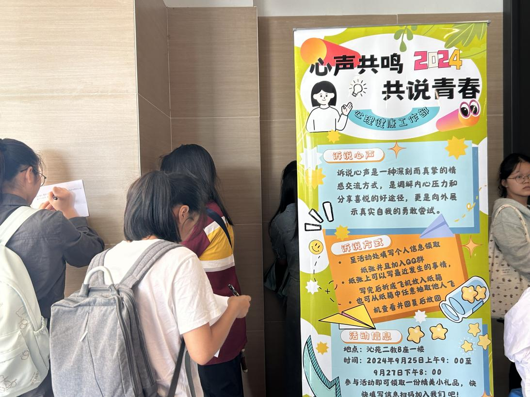 2024年9月25日至9月27日,由心理咨询中心主办、williamhill威廉希尔中文网站心理健康工作部承办的“心声共鸣,共说青春”心理健康主题活动在沁苑2教B座1楼圆满举办。此次活动旨在鼓励新生勇于诉说上大学以来的心路历程,传递温暖,营造积极向上的校园氛围。