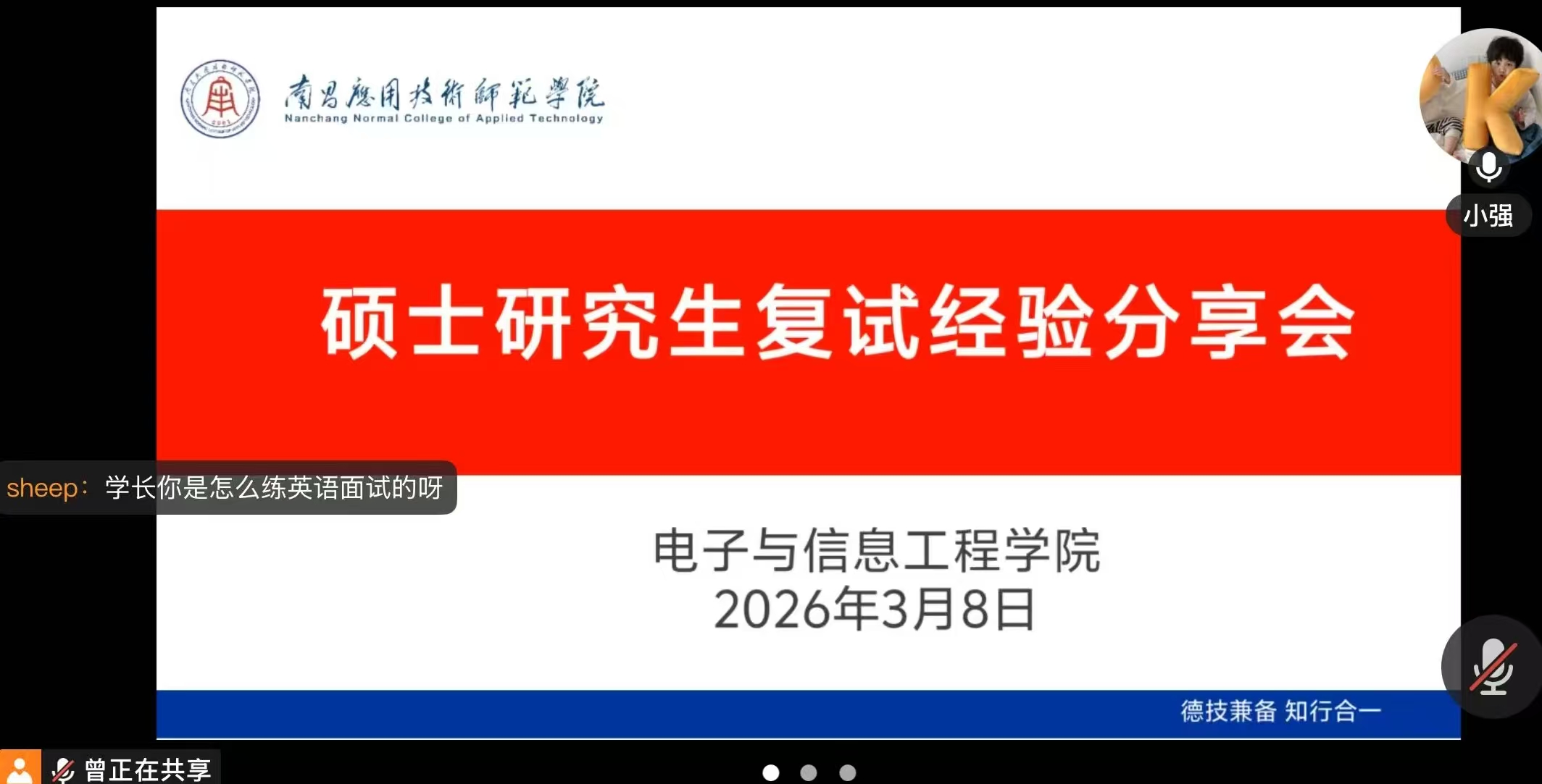 分享环节中,学长结合自身上岸经历,从复试流程解析、备考策略、实战技巧、心态调节等多个核心维度,为同学们带来了干货满满的分享。首先详细梳理了复试的完整流程,包括资格审核、笔试、面试(专业问答、英语口试)等关键环节,明确了各环节的时间节点与注意事项,帮助同学们精准把握备考节奏。针对专业课备考,学长强调,要夯实专业基础、梳理知识框架,重点关注学科前沿议题,避免模板化答题。英语复试要注重日常口语练习,积累专业词汇,自我介绍要突出个人优势;专业面试要逻辑清晰、态度诚恳,遇到不会的问题要坦诚虚心,展现良好的学习素养与应变能力。
