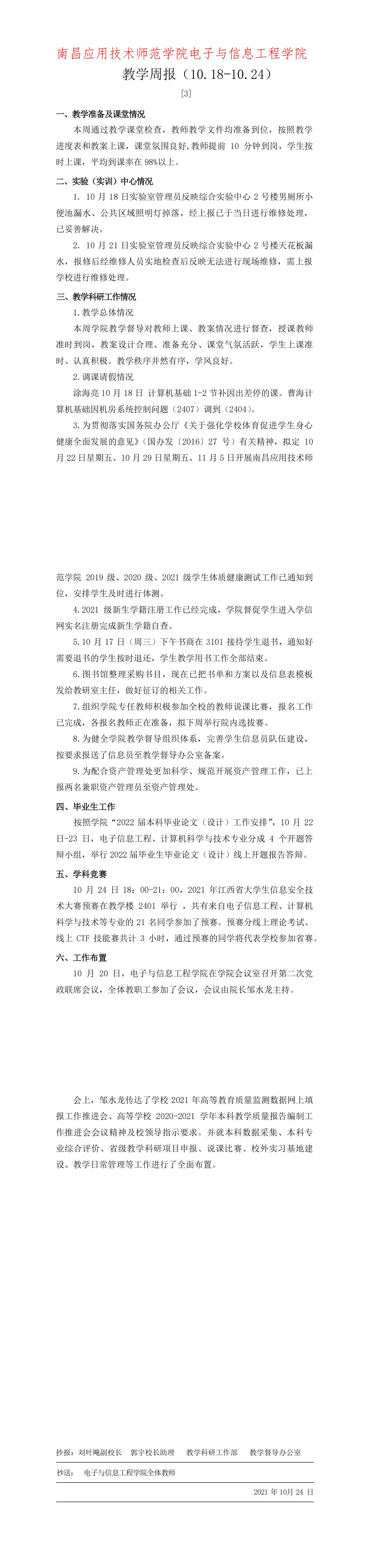 首页栏目 学院新闻 学院公告 学生工作 您现在的位置是:首页 > 首页栏目 > 学院公告 学院教学周报【3】号 管理员2021-10-24737 上一篇 学院教学周报【2】号 下一篇 电信学院关于评选2025-2026学年第一学期“优秀学生干部”、“优秀工作者”、“文明寝室”、“先进班集体”获奖名单公示