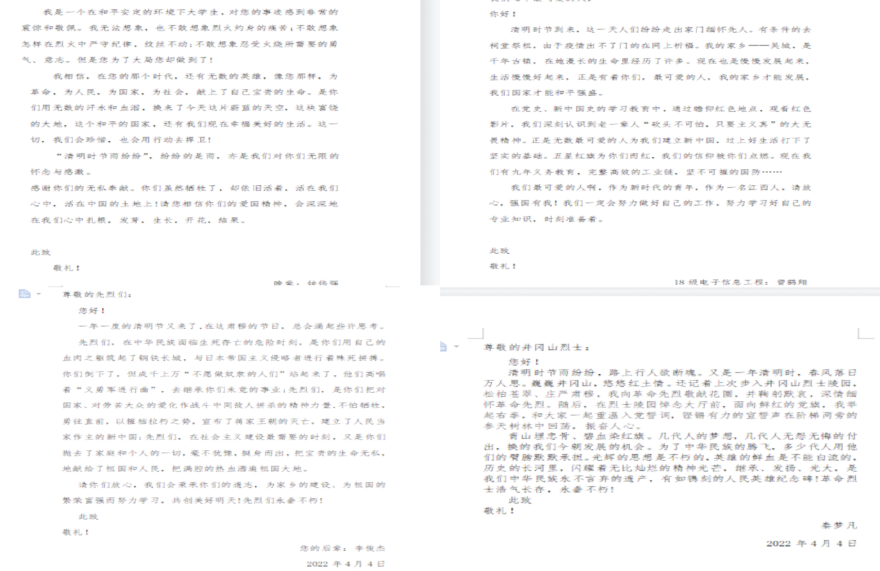 为引导学生党员慎终追远、缅怀先辈,继承先烈遗志,从英雄人物和时代楷模身上感受道德风范,珍惜幸福生活,自觉培育和践行社会主义核心价值观。学院党总支组织了“清明寄语”活动,邀请全院学生党员通过网络寄语先烈,寄托哀思,书写爱国之情、报国之志,表达对革命先辈的崇敬之情。