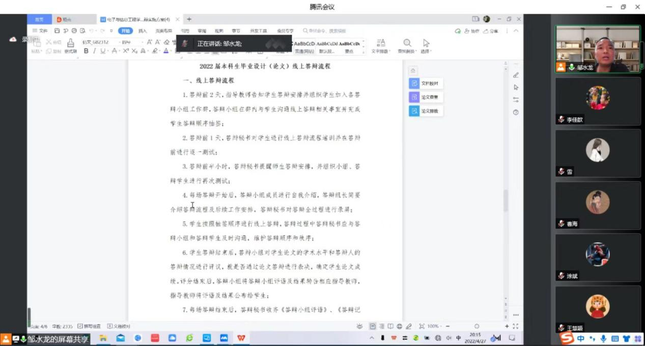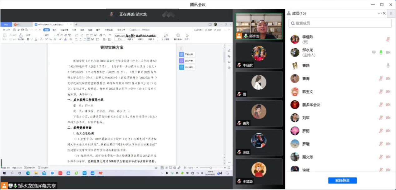 4月27日晚,williamhill威廉希尔中文网站利用腾讯会议,线上召开2022届本科毕业设计(论文)答辩工作会,学院各教务人员、全体教师参加了此次会议,会议由院长邹水龙主持。
