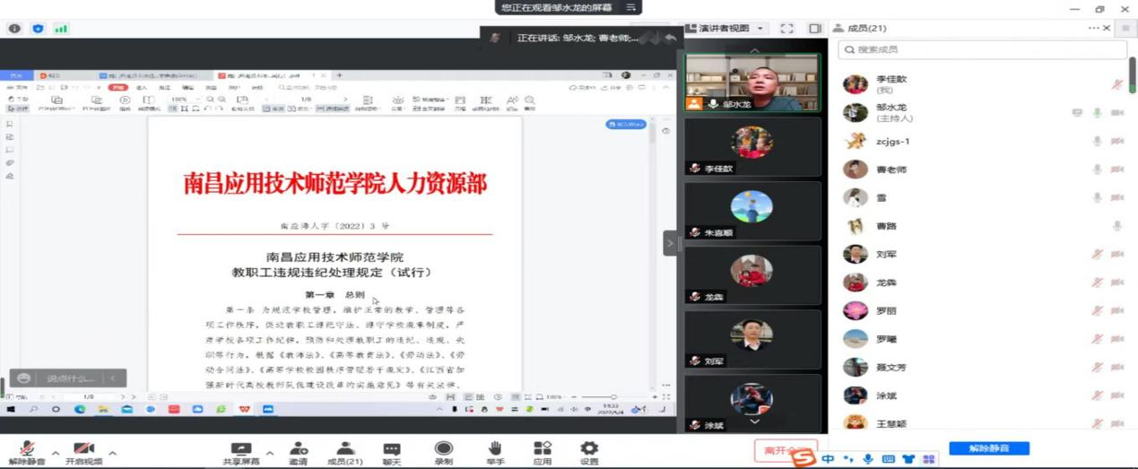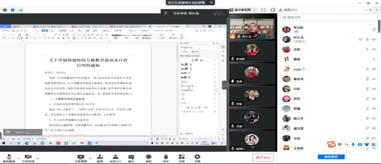 5月4日,williamhill威廉希尔中文网站利用腾讯会议,线上举行师德师风专题教育活动,全体教职工参加了此次活动,活动由院长邹水龙主持。