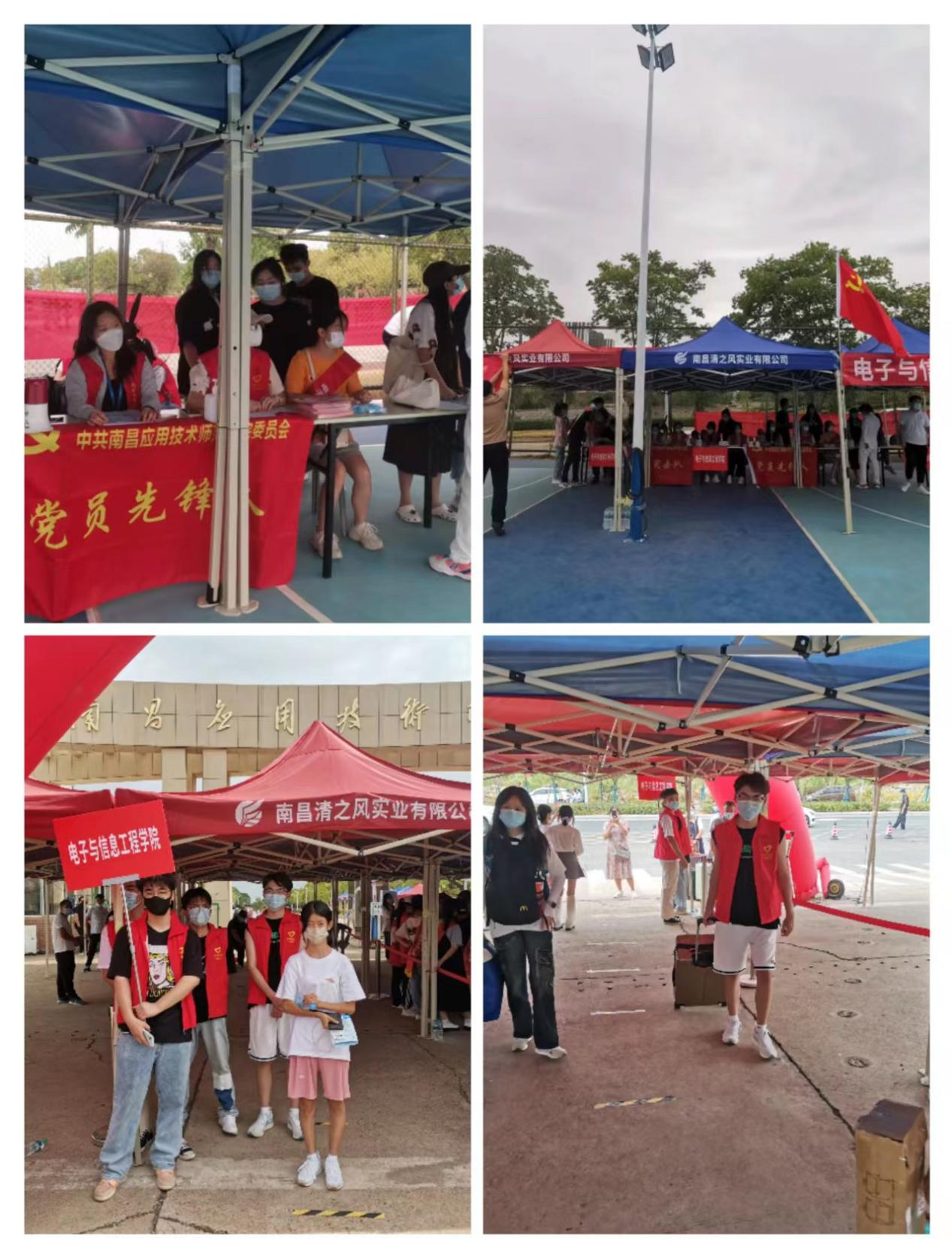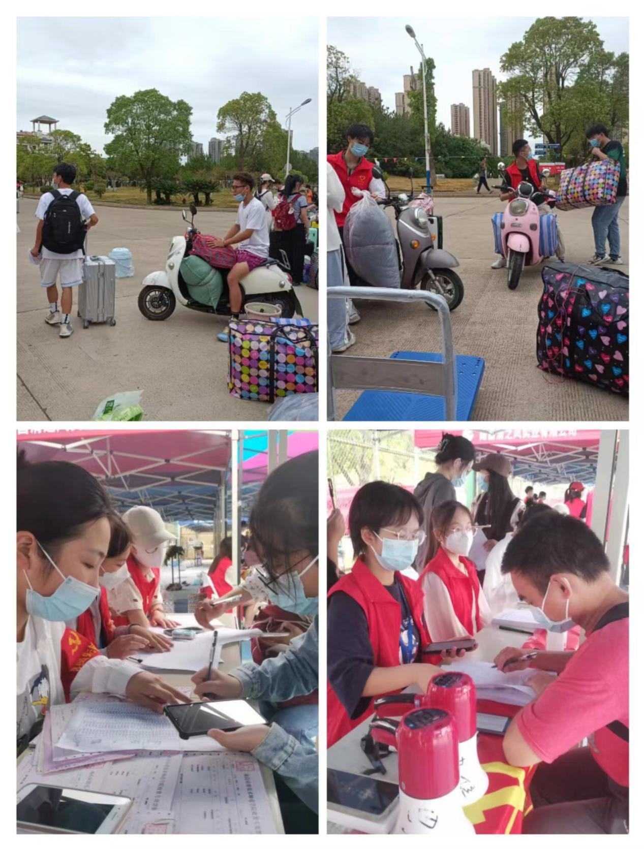 在学校的大门,学院设立了学生引导和迎新专属通道,身穿工作服、佩戴工作牌的志愿者们在专属通道为新生测体温填表并耐心解答新生问题。新生走进校门,学院学生志愿者会引导新生进入校园,志愿者们帮新生提行李,带领新生去报道点报道以及做核酸检测。引领过程中,学长学姐们会给新生讲述我们学院文化以及专业特色,告诉新生大学生活应该如何正确度过。天气炎热,为提高了学院新生报名时效,学院学生志愿者们骑着电动车带领着新生穿梭于学费缴纳、报名登记、行李及军训服领取处,有效加快学院新生报道的速度。