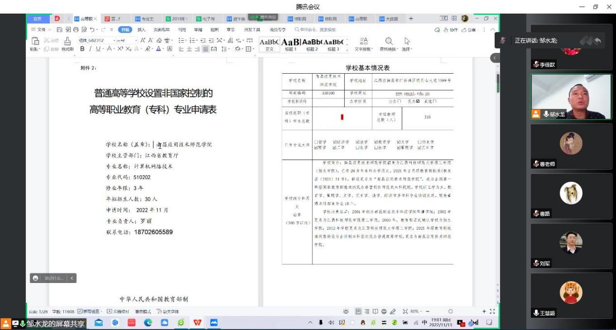 11月13日,williamhill威廉希尔中文网站利用腾讯会议,线上召开2022年度高职专科专业申报推进会,教务管理人员、各专科专业负责人参加了此次会议,会议由院长邹水龙主持。